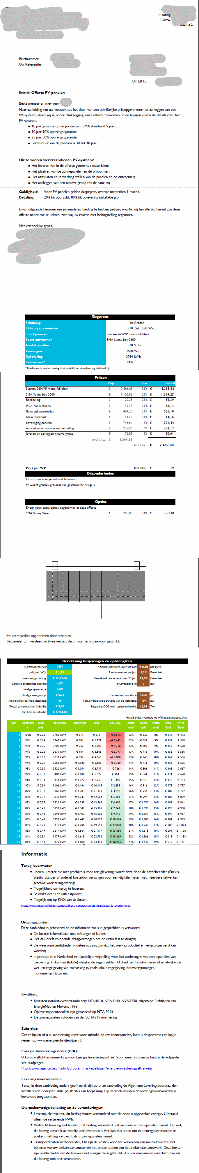- Vergelijking: Vergelijk offertes op basis van prijs per wattpiek (Wp) en totale kosten. Soms is een iets duurdere offerte op lange termijn voordeliger.